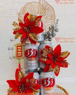 Đây là mẫu tháp bia sử dụng 9 lon bia 333 dung tích 330ml để xếp thành 3 tầng. Thiết kế tháp bia này còn được sử dụng các phụ kiện trang trí hoa màu vàng, đỏ, trắng,…xen kẽ vừa sang trọng, lịch sự lại còn vừa rộn ràng không khí ngày tết.