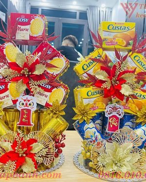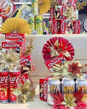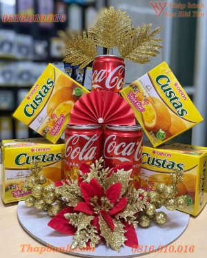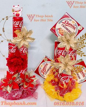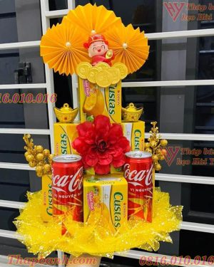 • Thành phần chính: 10 lon nước ngọt, hộp bánh các loại, đế tháp, các phụ kiện đính kèm như hoa điểm, vàng bạc châu báu trang trí,..